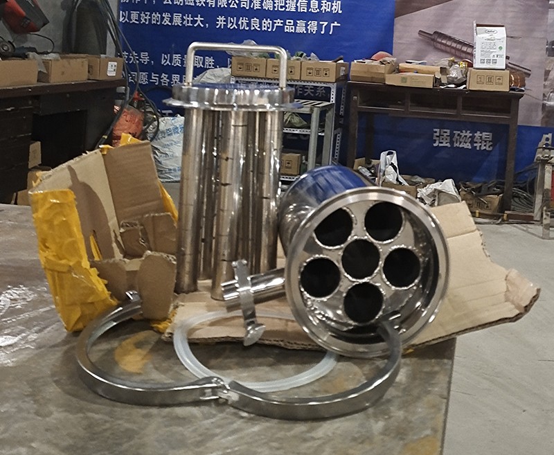 其原理為:當含鐵的物質通過時,受到強磁場的吸引力,將含鐵的物質牢固的吸附在管壁上,達到保證設備的不受鐵雜質的損傷和產品的安全,可以大大降低成品物料中的含鐵量。